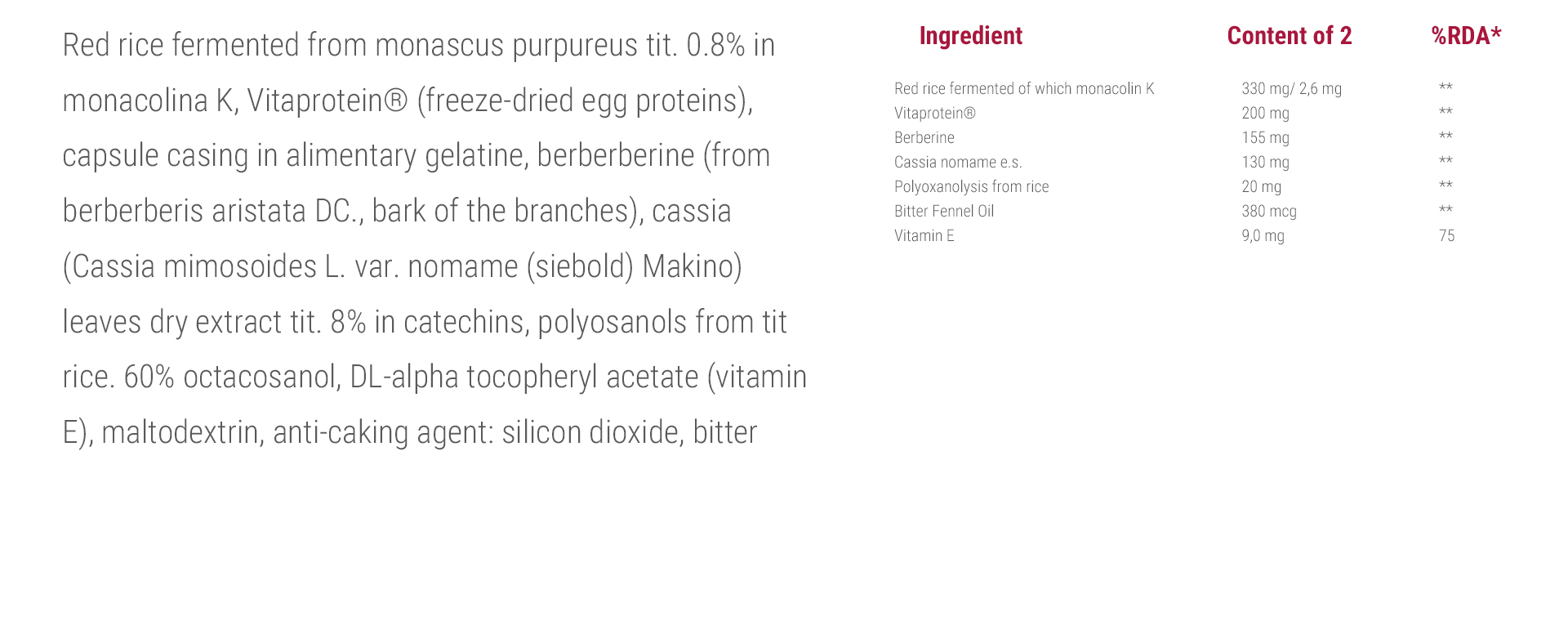 Viproactive® colest contains extracts of Cassia nomame to support the metabolism of triglycerides and cholesterol. Berberine from Berberis aristata could promote liver function. Fermented red rice is used to lower cholesterol, improve blood circulation, and improve digestion. Additionally, Vitamin E is important for the protection of cells from oxidative stress.