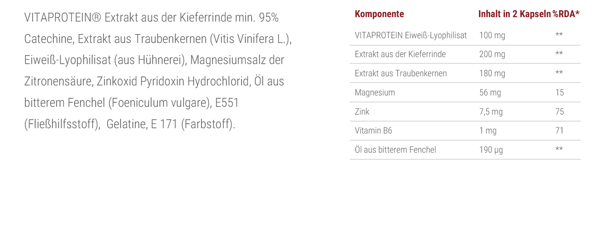 Viproactive Pinea enthält neben Vitaminen und Mineralstoffen auch Kiefernrinden- und Traubenkernextrakt, der antioxidativ wirkt und die Zellen vor Schäden durch freie Radikale schützt.