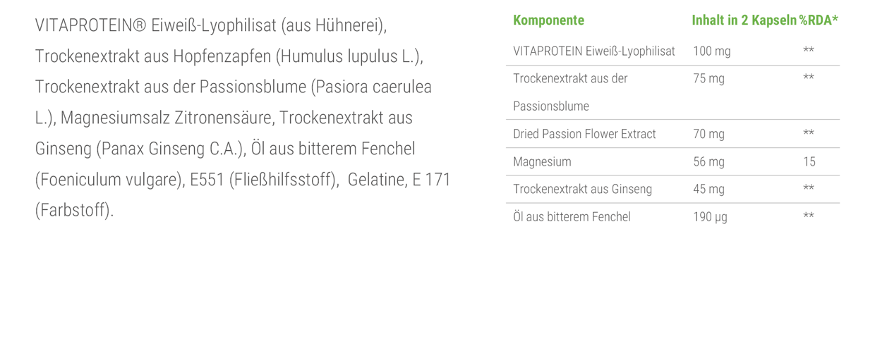 Das Pflanzenmaterial in Viproactive Relax besteht aus einer Passionsblume und zwei Extrakten, die die Zellen vor Schäden durch freie Radikale und oxidationsbedingtem Stress schützen – Hopfen und Ginseng.