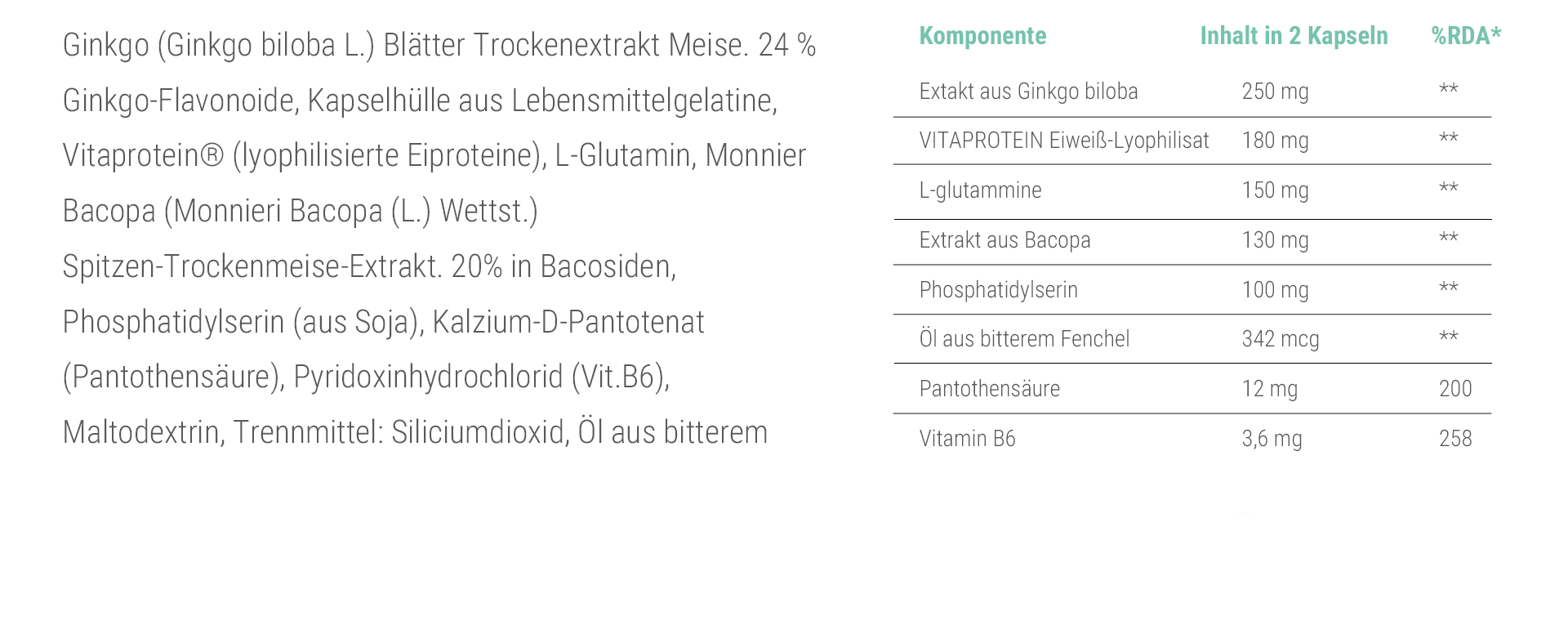 Viproactive® Memory enthält Ginkgo-Extrakte, die allgemein als „Gehirnkraut“ bekannt sind, und Bacopa-Extrakte zur Unterstützung des Gedächtnisses und der kognitiven Funktionen. Pantothensäure, die zu Energie und normaler Gehirnleistung beiträgt, und Vitamin B6, das nützlich ist, um das Gefühl von Müdigkeit und Erschöpfung zu reduzieren.