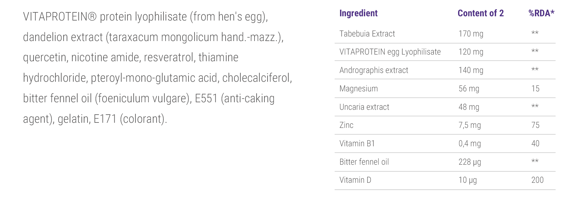 The plant extracts in Viproactive® Immuni Plus are andrographis, uncaria and tabebula. All strengthen the immune system. Andrographis also improves digestion, promotes carbohydrate metabolism and facilitates upper respiratory tract function, while Uncaria promotes joint function, and tabebuia facilitates cardiovascular-system and upper-respiratory-tract function, promotes proper blood pressure, and ensures normal perspiration and body-purification functioning.