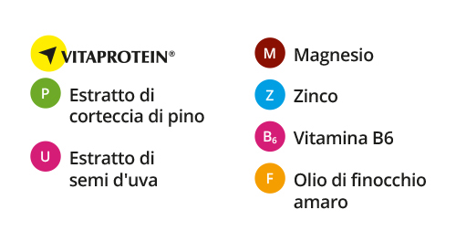 Magnesio citrato, estratto secco di pino (Pinus massoniana Lamb., corteccia), estratto secco di semi d’uva (Vitis vinifera L., semi) titolato al 95% in catechine, involucro capsula in gelatina alimentare, Vitaprotein® (proteine dell’uovo liofilizzate), ossido di zinco, cloridrato di piridossina, olio di finocchio amaro (Foeniculum vulgare Mill., olio essenziale), agente antiagglomerante: biossido di silicio.