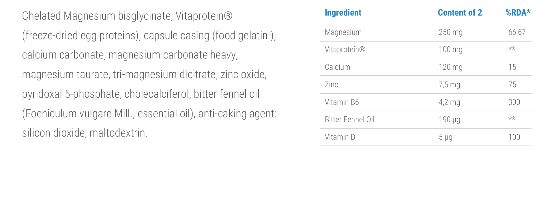 The crucial ingredient in Viproactive® magB6 Forte is magnesium. It not only facilitates muscle function, but also reduces tiredness and fatigue, and contributes to protein synthesis, electrolyte balance and normal psychological functioning. Another important ingredient is zinc, which helps ensure normal cell division and protects cells from oxidative stress. The Vitamin B6 in our formulation contributes to energy-yielding metabolism, to the regulation of hormone activity, and to nervous-system and immune-system functioning. We included calcium to maintain bones, to facilitate neurotransmission, and to promote energy-yielding metabolism. The Vitamin D in Viproactive® magB6 Forte also helps facilitate immune-system functioning.