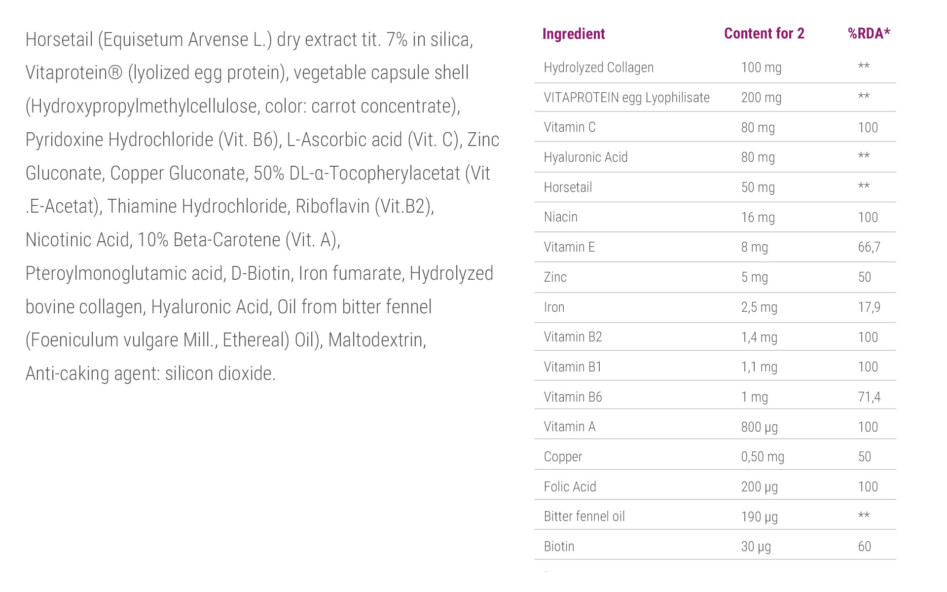 Navimeso® follows our patented nutrition technology – Vitaprotein® where the nutritions from the supplement pill will be carried “smart” by the encoded protein to be metabolized in the suitable body cells. Therefore, the skin cells will be able to effectively and actively absorb these nutritions. By providing our skin with the active ingredients it needs, we are improving our skin from the inside and in a sustainable way.